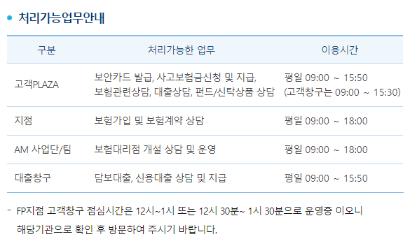 고객 PLAZA는 보험금 청구 및 보험 관련, 대출 상담 등 고객님을 위한 서비스 센터입니다. 하지만 이용시간이 평일 09:00~15:50(고객 창고 15:30)까지니, 미리 서둘러 방문하셔야 합니다. 전화로 불가능한 업무들은 반드시 가까운 지점 또는 고객 PLAZA를 이용해서 처리해야 합니다.