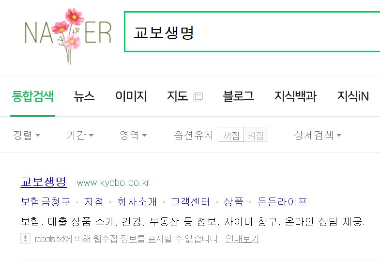 교보생명은 대한민국 재계 서열 30위 기업으로 국내 보험업계 3위, 영업이익과 순익익 기준으로는 2위를 차지하고 있습니다. 우선 네이버 홈페이지에 교보생명으로 들어갑니다.